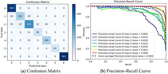 Each column of the confusion matrix represents the identified class, and the total number of each column indicates the number of data identified as that class. Each row represents the actual class of the data, and the total amount of data in each row indicate the number of data instances in that class. From the confusion matrix in Figure 13a, the value in each column indicates the number of actual data identified as the class. For example, 460 in the first column of the first row means that 460 instances belonging to class 0 are identified as class 0. Similarly, the 8 in the second column of the first row indicates that there are 8 class 0 that are incorrectly identified as class 1. From the precision–recall curves in Figure 13b, it can be seen that the precision–recall rate for class 0 is 0.998, for class 1 is 0.843, for class 2 is 0.918, for class 3 is 0.921, for class 4 is 0.893, for class 5 is 0.981, and for class 6 is 0.998. The average precision–recall rate is 0.963.