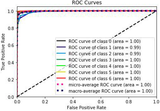 The optimal set of parameters obtained from Bayesian optimization is input into the FL-XGB model to obtain the ROC curve of the model. The area of the ROC curve indicates its characteristics. When the area enclosed by the ROC curve is 0.5 for random classification, the identification ability of the model is 0. The closer the area is to 1 indicates that the identification ability of the FL-XGB model is stronger. From Figure 15, the area of the ROC curve is close to 1, indicating that the FL-XGB model has a strong identification effect on VPN-encrypted traffic.