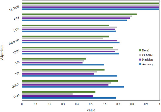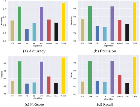 The performance comparison results of each algorithm under the indicators of Accuracy, Precision, F1-Score, and Recall are shown in Figure 16.