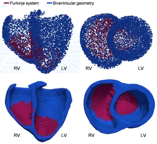 All the aforementioned approaches are based on solving the electrophysiological model equations with the finite-element method (FEM) as a numerical technique based on a mesh discretization of the biventricular heart geometry, as it is the common choice in cardiac modeling []. In FEM, the computational domain is divided into discrete subsets of interconnected nodes as elements. However, the explicit connectivity required in the domain leads to great difficulty in generating the irregular patient-specific cardiac meshes, which then becomes a tedious, manual, highly interactive, and time-consuming process. Moreover, the reliability of the simulation results is highly dependent on the quality of the built geometrical mesh []. Additionally, mesh distortion that can occur during large cardiac deformations enforces the use of remeshing algorithms to restore mesh shape and numerical accuracy, thereby increasing the computational cost and efforts []. Meshless methods are an interesting alternative to avoid meshing difficulties, since the spatial domain is composed of an unstructured particle cloud without connectivity. Therefore, the meshless domain construction procedure can be used for any type of complex geometry. In addition, large deformations or the linking of meshes with different spatial resolution, often necessary in cardiac electromechanics, can be better handled with meshless methods than with FEM, as FEM-based connectivity does not need to be satisfied. For instance, authors in [] have shown the potential of meshless methods for fluid–structure interaction (FSI) applications, which are extremely time-consuming for mesh-based methods.