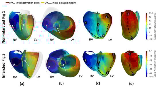 Electroanatomical maps of an infarcted and a non-infarcted training case in left bundle branch block condition. In (a,b), both initial activation points (1) in the RV epicardial layer (red circle) and LV endocardial one (yellow circle) are shown. At (c,d), the numbering sequences describe the followed electrical pattern to fully activate the biventricular geometries: starting from the initial stimulus (1), following to the biventricular apex (2), and propagating to the left ventricular base (3). The colourscale represents the local activation times, from earliest to the latest activation points, in blue and red, respectively. : right ventricle epicardium. : left ventricle endocardium.