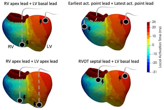 - Carpio, E.F.; Gomez, J.F.; Sebastian, R.; Lopez-Perez, A.; Castellanos, E.; Almendral, J.; Ferrero, J.M.; Trenor, B. Optimization of lead placement in the right ventricle during cardiac resynchronization therapy. A simulation study. Front. Physiol. 2019, 10, 74. [Google Scholar] [CrossRef]