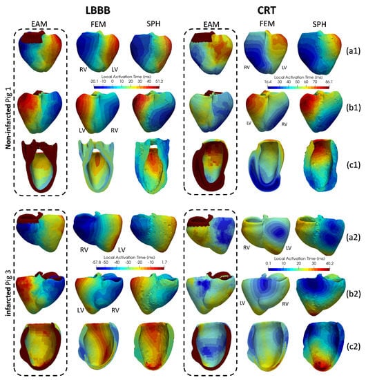 Local activation time maps for a non-infarcted and an infarcted (top and bottom panels corresponding to Pig 1 and Pig 3, respectively) case of the training database in left bundle branch block (LBBB) and cardiac resynchronization therapy (CRT) conditions, provided by the electroanatomical measurements (EAM) and electrophysiological simulations performed with a finite-element method (FEM) and a meshless (SPH) model. (a1,a2) and (b1,b2) correspond to anterior and posterior biventricular epicardial visualizations. (c1–c2) show endocardial view of the left ventricle (LV) lateral wall. RV: right ventricle.