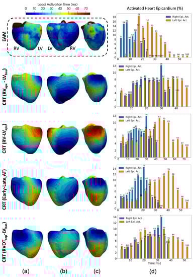 Local activation time maps ((a–c) showing anterior/posterior of biventricular epicardium and LV lateral wall epicardium, respectively) after cardiac resynchronization therapy (CRT) from the electro-anatomical (EAM) data and meshless simulations in the non-infarcted testing case, Pig 5. Histograms of the percentage of electrically activated heart tissue for the right and left epicardial layers are in the right column (d). From the second to the fifth row, different simulation results obtained with different CRT lead locations are displayed. : leads on right ventricle (RV) apex and basal left ventricle (LV). : both leads are located in the biventricular apex. : leads located at the the earliest and latest EAM ventricular activated points, respectively. : leads in the septal RV outflow track and in the basal LV.