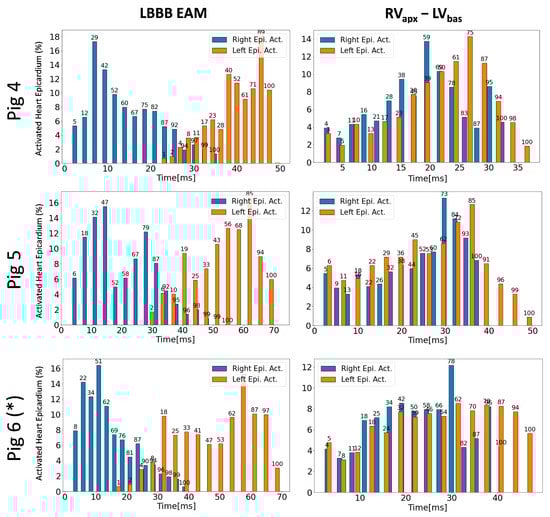 The non-infarcted cases of the testing database (Pig 4 and Pig 5) had an identical overall behavior with respect to optimal lead configuration. However, they presented large TAT errors between SPH-based simulations and EAM data (22.2 ms and 15 ms for Pig 4 and Pig 5, respectively), with CRT simulations providing lower TAT values and, consequently, larger recovery than EAM data (see Table 3). The difference between optimal SPH-based simulations and EAM measurements was due to a different lead location. Figure 7 shows the histograms of the percentage of electrically activated heart tissue for both ventricles under LBBB and CRT conditions for the three analyzed testing cases, showing the large synchronization recovery achieved for all cases.