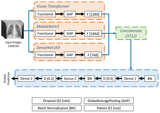 This section describes the implemented DL architecture based on the ensemble learning technique. The objective of the proposed method is to learn and extract medical image representation using three well-known DL models, including MobileNetV2, DenseNet169, and Vision Transformer (VIT). As shown in Figure 1, the input image to the ensemble method is fed to three functional layers simultaneously. At this stage, each functional layer represents a pretrained model that relies on MobileNetV2, DenseNet169, and VIT, respectively. For dimensionality reduction, each functional layer’s output (learned representations) is fed to the global average pooling layer. After applying the pooling operation on each parallel flow, the output is flattened and concatenated to generate a single feature vector of each inputted image. To fine-tune the overall network, overcome overfitting, and boost the classification accuracy, a sequential set of layers were placed on top of each other, including batch normalization (BN), fully connected layer (dense), and dropout layer, as shown in Figure 1. The final output of the ensemble method is generated using a fully connected layer to output the classification result.