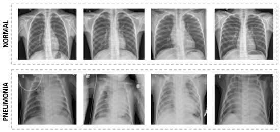 Pneumonia diseases have been verified for our experimental assessment, including the diagnosis of pneumonia from chest X-ray images. Figure 2, for instance, displays chest X-ray images from the selected data set. This data set is split into two sets: normal and pneumonia. The data set was provided by Kermany and Goldbaum [43] and based on a chest X-ray scan images from pediatric patients from one to five years of age at the Guangzhou Women and Children’s Medical Center. In the chest X-ray images (Pneumonia) data set, which is publicly available at https://www.kaggle.com/paultimothymooney/chest-xray-pneumonia (accessed on 4 January 2022), there are in total 5856 normal and pneumonia chest X-ray images. To provide a fair comparison between our proposed method and the different methods, the training set, the validation set, and the test set were previously divided. The chest X-ray database was divided into two classes (normal and pneumonia). This data set contains two subsets for each class. The training subset consists of 1341 normal patients and 3875 pneumonia patients. Moreover, it contains 234 patients as normal and 390 pneumonia patients for the test subset. These data also consist of 16 validation data images, including eight pneumonia patients and eight normal patients. Samples of normal and pneumonia chest X-ray images can be seen in Figure 2.