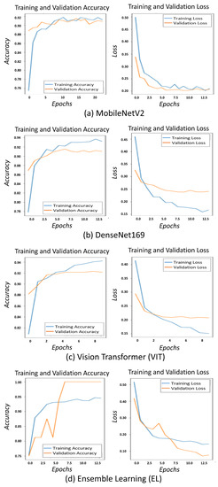 The performance of MobileNetV2, DenseNet169, Vision Transformer (VIT), and the proposed ensemble learning (EL) method on training and validation losses and accuracy is compared in Figure 3. The proposed method reduced verification loss, as shown in the figure, which improved the accuracy results. DenseNet169’s training loss is 0.1664, training accuracy is 0.9319, validation loss is 0.2408, and validation accuracy is 0.9103. Additionally, MobileNetV2 achieved a training accuracy of 0.9122, a training loss of 0.2096, a validation loss of 0.2072, and a validation accuracy of 0.9087. The VIT had a training loss of 0.1503, a training accuracy of 0.9421, a validation loss of 0.2071, and a validation accuracy of 0.9215. The proposed ensemble method had a training loss of 0.1361, a training accuracy of 0.9525, a validation loss of 0.0421, and a validation accuracy of 1.0.