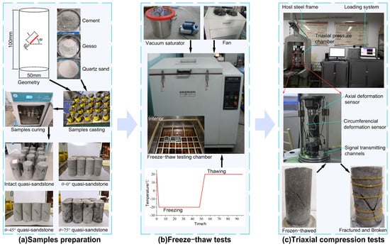 In summary, many studies on frozen–thawed rock or a rock mass have focused on testing the freeze–thaw times, water saturation, loading forms, and whether there are prefabricated fissures. Most of them were limited to uniaxial compression tests, without considering the influence of confining pressure. There have been few reports on the damage constitutive model of frozen–thawed rock, and even fewer studies have synthetically considered the influence of cracks, freezing–thawing, and confining pressure. Therefore, in this research, based on previous studies, freeze–thaw tests were carried out at different temperatures on quasi-sandstone with prefabricated single fissure at different angles. Triaxial loading experiments were performed on all samples to explore the effects of freezing temperature and fissure angle on the fracture characteristics and damage evolution of quasi-sandstone. The results provide a reference for the construction of mining shafts by the artificial freezing method in water-rich sand layers.