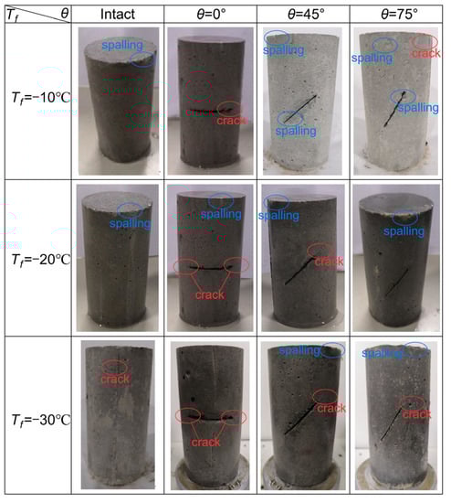 Figure 2 is a damage diagram of quasi-sandstone after thawing for various freezing temperatures. It shows that the intact quasi-sandstone and the quasi-sandstone with different angle fissures have different degrees of surface spalling or crack propagation after thawing. There are two main types of frost-heaving fracture mode of the original fissure [52]: (i) Coplanar frost-heaving propagation cracks appear at the end of the prefabricated fissure, propagate along the direction of the original fissure for a certain distance, and gradually turn to the short side of the sample. These are called ‘coplanar propagation cracks’. (ii) The two sides of the middle of the prefabricated fissure produce a frost-heave propagation crack in an approximately horizontal direction, which is called a ‘horizontal propagation crack’.