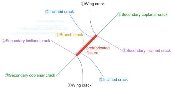 According to Huang et al. [52], frost-heaving cracks have different effects on the fracture mode of quasi-sandstones with a single fissure at different angles under uniaxial compression. According to the research of Xiao et al. [53] on the crack coalescence of single-fissured rock, with the increase in ambient pressure, the failure mode of quasi-rock gradually becomes ductile, and the crack propagation in quasi-rock is more complicated. Single-fissured rock under triaxial compression mainly has three kinds of through fracture form [54]: tensile, shear and tensile–shear mixed failure. The main branch cracks at the prefissured apex of rock under triaxial compression are [55]: (1) wing crack, (2) secondary inclined crack, (3) secondary coplanar crack, (4) branch crack and (5) inclined crack, as shown in Figure 3. For the saturated macro-fissures in this experiment, the freeze–thaw cycle with a freezing temperature of −10 °C can drive the fissure tip to initiate new macro-frost-heaving cracks. It is necessary to study the influence of frost-heaving cracks on the fracture mode of triaxial compression.