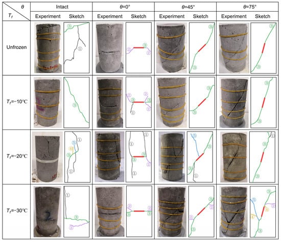 Therefore, typical failure samples with a confining pressure of 2 MPa and freezing temperatures of unfrozen, −10, −20 and −30 °C, are selected for analysis, and the fracture failure diagram of quasi-sandstone with three kinds of single-fissured angles at four freezing temperatures is obtained, as shown in Figure 4. The intact rock sample shows tensile–shear failure under triaxial compression without freezing, and the single-fissured sample is a shear-slipped failure. Tensile cracks are mainly produced in rock samples without prefabricated fissures, and shear oblique cracks appear at the upper end. When θ = 0°, the fracture mode of the sample mainly presents as secondary inclined cracks (2) at both ends of the prefabricated fissure. When θ = 45°, the secondary coplanar crack (3) initiates at the apex of the prefissure, and its initiation direction is along the direction of the prefabricated crack. When it extends to a certain extent, the upper and lower cracks (3) deflect toward the orientation of the maximum main stress until the end of the sample. When θ = 75°, two secondary coplanar cracks (3) initiate at the apex of prefissure, and its initiation direction is the same as that of the prefabricated fissure. When it extends to a certain extent, the upper crack (3) deflects toward the orientation of the major principal stress until the end of the rock sample, and the lower crack (3) propagates tortuously along the orientation of the resultant force of the maximum main stress and the minimum main stress until reaching the lateral face of the sample.