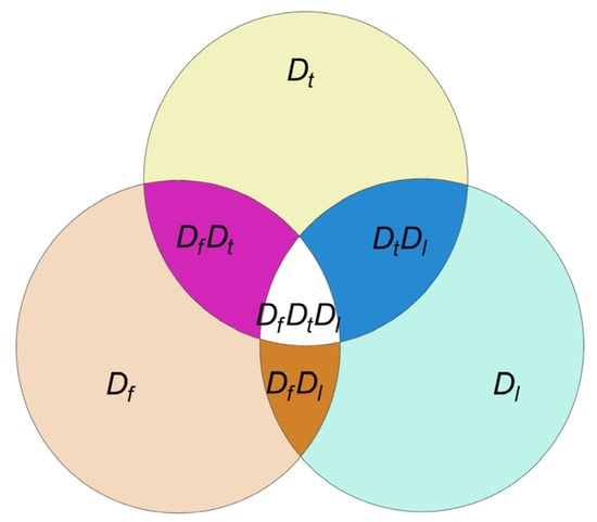 From Equation (12), it can be perceived that the fissure damage variable reflects a macroscopic single fissure that increases the total damage to the quasi-sandstone, the freeze–thaw damage variable reflects freeze–thaw action that increases the total damage to the quasi-sandstone, and the loading damage variable reflects the continuous damage deterioration trend of quasi-sandstone under static loading. The respective effects and coupling effects of the three types of damage aggravate the total damage, and the coupling term is expressed by DfDtDl. However, the coupling effect of each two damage types can reduce the total damage, and the coupling term is expressed by DfDt, DfDl, and DtDl.