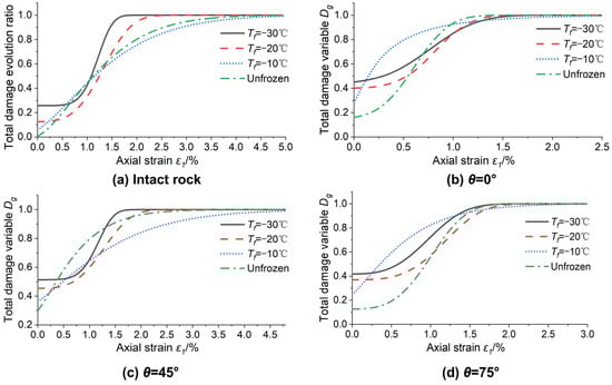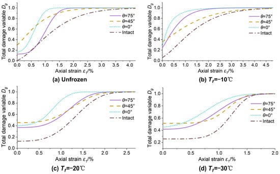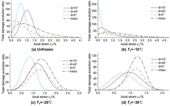 Similarly, the total damage evolution curves of single-fissured quasi-sandstone subjected to static loading after freezing–thawing at four temperatures can be obtained (Figure 7). In terms of the initial damage, the order from small to large is as follows: intact quasi-sandstone < θ = 75° < θ = 0° < θ = 45°. However, according to the order in which the cumulative damage first reaches 1 is θ = 0°, 75°, 45°, and intact quasi-sandstone. In terms of the shape of the curve, the intact quasi-sandstone is similar to θ = 45°, and θ = 0° is more similar to θ = 75°. According to a study by Zhang et al. [46], the S-shaped damage evolution curve corresponds to each stage of triaxial compression of quasi-sandstone. (i) The stage of fissure compaction and elastic deformation corresponds to the quasi-horizontal section at the beginning of the damage–strain curve under loading, and the damage variable is almost unchanged. (ii) In the plastic deformation stage, the damage variable increases rapidly, corresponding to the concave section of the damage–strain curve. (iii) In the strain-softening stage, corresponding to the convex section of the damage–strain curve, the slope of the curve gradually decreases. (iv) In the residual deformation stage, the quasi-sandstone damage variable remains 1.