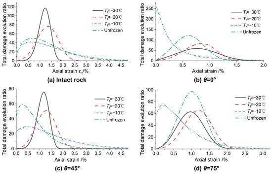 Figure 8 shows that, with the increase in axial strain, Tf = −10 °C, unfrozen, Tf = −30 °C and Tf = −20 °C successively reach the peak of the damage change rate. The damage evolution curves of Tf = −20 °C and Tf = −30 °C show symmetrical distribution characteristics for the axial strain, whose law resembles a normal distribution. The curve of unfrozen and Tf = −10 °C shows a partial normal distribution truncated by the longitudinal axis.