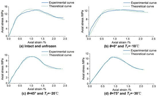 Figure 10 is based on the results of the freeze–thaw and static loading tests shown in Table 3. Using Equations (14), (22), and (23), the theoretical curves of the total damage constitutive model of quasi-sandstone with four single-fissured angles subjected to static loading after freezing–thawing at different temperatures were calculated, and they are compared in Figure 10 with the experimental curves.