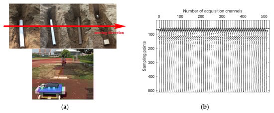 As shown in Figure 1a, the GPR detection trolley is used to detect the buried object in a sand bunker. The trolley moves at a constant speed along a straight line to collect 512 channels of A-Scan data; each has 1024 samples. Generally, the convolution of GPR wavelet and reflection sequence constitutes the echo of GPR detection system. The radar first receives the strong reflection signal of the upper surface. When the transmitted pulse encounters the target in the underground, there is a reflected signal of the target, which is relatively weak. Figure 1b is the time stacking diagram of the first 512 sampling points. It can be seen that the strong wavelet submerges the signal of target. Moreover, the wavelets at the adjacent monitoring points on the same survey line in the same detection area are very similar.