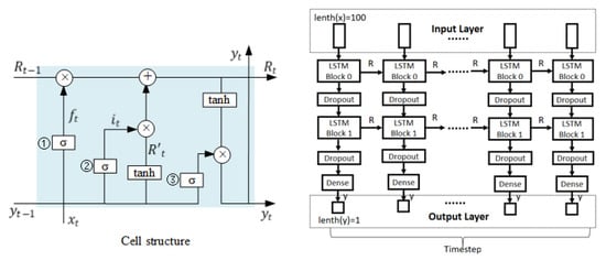 The network structure contains two-layer LSTM, two-layer Dropout, and one-layer Dense. The dropout probability of 0.2 is set to prevent overfitting. The timestep is 100, batch size is 200, epoch is 200, and learning rate is 1 × 10−6. The input length of each timestep is 100, and the output length is 1. If the loss does not decrease within 10 epochs, the learning rate is dynamically adjusted to be 0.1 times that of before.