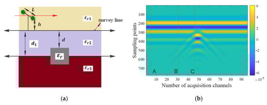 Detection of buried targets by ground penetrating radar. (a) Schematic diagram of GPR measurement. (b) Time accumulation diagram.