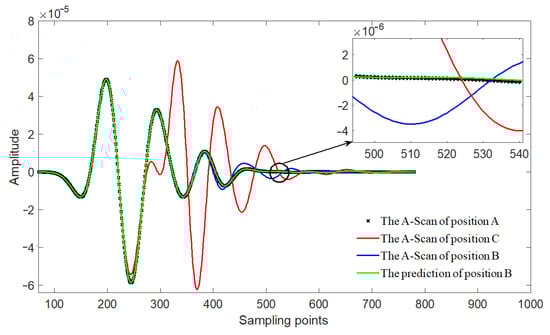 From the test set, we randomly selected two channels to connect into a sequence with 780 × 2 = 1560 samples as the network input for the prediction of wavelet. For example, the 5th, 32nd, and 48th channels of A-Scan data (corresponding to A, B, and C in Figure 4b, respectively) are used to evaluate the wavelet prediction ability of the trained network. Position A is far away from the target, and it contains less target signal. This channel of A-scan data is used as the ground truth of the wavelet. Position B is close to the target, and the corresponding A-scan echo contains some target signals. As shown in Figure 7, the predicted wavelet of green line is consistent with the ground truth of black dot line. The enlarged view in the upper right corner shows that the predicted wavelet amplitude is non-zero after the 510th sampling point, due to the reflected signal of the underground layer.