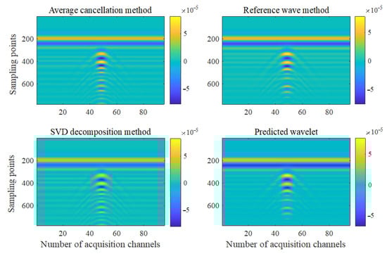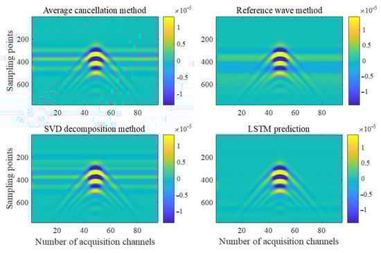 Figure 8 shows the results of wavelet removal with different wavelet extraction methods. The above two figures still contain residual direct waves and the layered interference. Although the reference wave method removes the direct wave cleanly, the layered interference is still obvious. The removal of the wavelet predicted by the above LSTM network can effectively remove the direct wave and the layered interference at the same time and improve the signal-to-noise ratio and resolution.