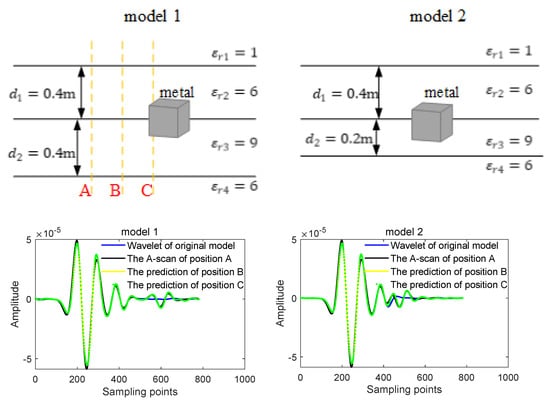 In the first group of experiments, we change the layered structure. We firstly add another layer at different depths to generate two new models, as shown in Figure 10. The network trained above with the original model in Figure 4 does not need to be trained again. We select three channels of A-scan data, corresponding to positions A, B, and C, to test the generalization ability of the LSTM network trained above. Position A is far away from the target, so the corresponding A-scan echo, shown as the black line in Figure 10, is used as the ground truth of the wavelet for the new scene. The yellow line and the green dotted line are the predicted wavelet with the A-scan echo at position B and position C, respectively. It can be seen that the wavelet of the new scene contains a new signal peak at the tail of the echo, which is consistent to the new layer position. Therefore, the proposed network can predict the response of the new layer structure.