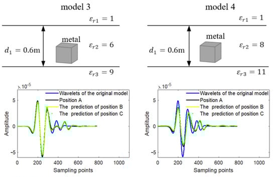 As shown in Figure 11, model 3 only changes the thickness d1. According to the layered geometry, the position of the second layer signal will change from the 387th sampling point to the 465th sampling point. Model 4 further changes the dielectric constants of the two layers, and the position of the second layer signal is moved to the 417th sampling point. The LSTM network trained above with the original model is used to predict the wavelet for the new model directly. The prediction results correctly indicate these layered geometries. Therefore, the proposed network can capture the layer thickness and background medium to make accurate predictions quickly.