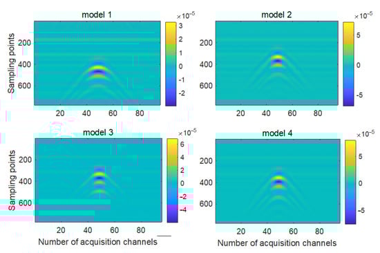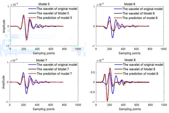 Figure 13 shows the prediction results of models 5–8. The blue line is the wavelet of the original model in Figure 4. The black line is the A-Scan without the target signal, and it is the ground truth of the wavelet for the new model, which is quite different from the original model. The network is directly used to predict the wavelet for the new models, without retraining. The red line is the predicted wavelet with the A-can echo at position B of the derived model. Although multiple parameters, such as the layered geometry, medium parameters, target information, and excitation waveform, are all different from the original model in Figure 4, the LSTM network still can predict the accurate wavelets.