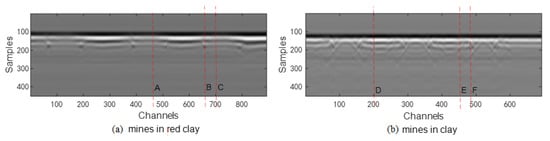 In order to explore the practicability of this method, a group of measured data are used to test the performance of the above method for wavelet extraction. Several landmines are buried in red clay and clay scenes for experiments, and the LTD series GPR of China Research Institute of Radio wave Propagation (CRIRP) is used to collect echo data. Red clay is a soil with high water content formed by carbonate weathering and has a large relative permittivity εr = 12. The water content of the clay is low, and the relative permittivity εr = 12 is low. The parameters of red clay and clay are listed in Table 2. There are 893 and 692 channels of A-scan data from red clay and clay scenes, respectively, each with 1024 sampling points, as shown in Figure 14. Different background media cause different attenuation of EM waves in two scenarios. Therefore, the echo data are significantly different.