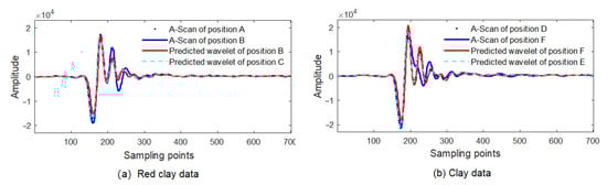 A total of 38 channels of A-scan data of the red clay detection are randomly selected to splice in sequence as the training set. The training process is the same as above and ends when the loss is less than 0.0001. Then, another 12 different channels of A-scan data are randomly selected to predict the wavelet, as shown in Figure 15. It can be seen that the network can well predict the wavelet whether the echo contains the target signal or not. The strong signal at the 200-th track of the blue line corresponds to the reflected signal from the mine. The LSTM network can separate the wavelet from the target signal and environmental interference. Then, the trained network with red clay data is directly used to predict the wavelet of the clay scene, as shown in Figure 15b. The predicted wavelet is close to the A-Scan without the target signal, which is the ground truth of the wavelet for the clay background.