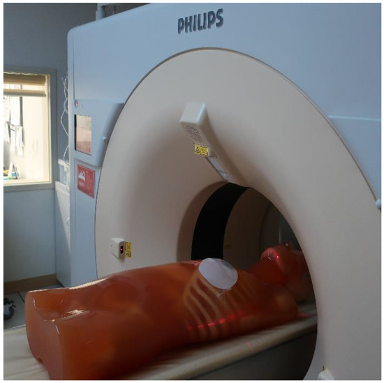 CT simulation was performed on an anthropomorphic torso phantom (CT torso phantom CTU-41, Kyoto Kagaku America Inc., Torrance, CA, USA) using a Philips Brilliance CT scanner (Philips Medical Systems, Cleveland, OH, USA) (Figure 2). This was used since phantom materials with radiation absorption approximates to human tissue (heart, aorta, and vena cava: 40 Hounsfield unit (HU); pulmonary vessels: 8 HU; rib cartilage: 90 HU; and liver: 70 HU) and allows scanning under actual clinical settings. To reproduce TE insertion following mastectomy, a male phantom was used with two types of TE, which were equally set to 345 cc and attached on the left chest wall. TEs were adjusted to be in the same position by referring to three-plane CT imaging. Afterwards, 2.5 mm thick axial images were acquired for RT planning. To reduce CT artifacts caused by the metal implants, a commercial metal artifact reduction for orthopedic implants (O-MAR, Philips Medical Systems, Cleveland, OH, USA) was also applied to the CT images.