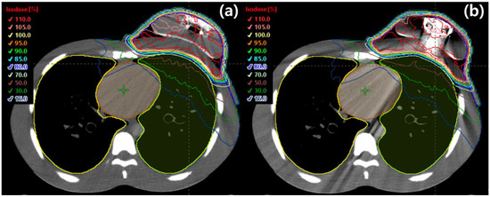 Delineation of the clinical target volume and planning target volume (PTV) was carried out by a physician (M.K.) in accordance to the European Society of Therapeutic Radiology and Oncology-Advisory Committee for Radiation Oncology Practice (ESTRO-ACROP) guidelines [10]. The whole heart was delineated superiorly, starting inferior to the left pulmonary artery and inferiorly blending with the diaphragm [11]. RT planning was performed using the EclipseTM treatment planning system for HalcyonTM (Varian Medical Systems, Palo Alto, CA, USA). The prescription dose to PTV, which was 50 Gy in 25 fractions, was given at the isodose line, encompassing at least 95% of the PTV while limiting maximum doses to less than 107%. Furthermore, the heart, ipsilateral lung, contralateral lung, whole lung, and contralateral breast were delineated as organs at risk (OAR).