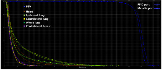 Dose-volume histogram for planning target volumes and organs at risk in radiation therapy plans of both radio frequency identification port and metallic port.