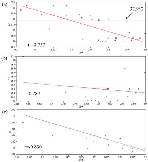 The Spearman correlation r between CDF(E(k = 19)) and body temperature is shown in Figure 4. The r values are −0.757, 0.287, and −0.830 in all subjects, the non-fever group and the fever group, respectively.