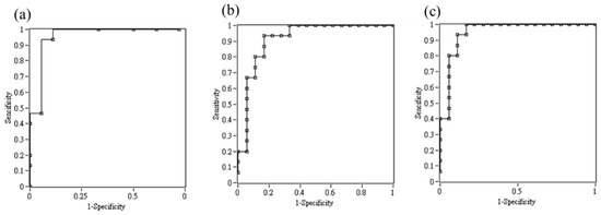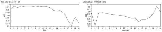 The AUC, calculated from the ROC, of each entropy variables are shown in Table 2 The AUC of CDF(E(k = 19)) had the highest value of 0.915, the sensitivity is 0.933, and the specificity is 0.833. Figure 5 showed the AUC distribution of E(k) and CDF(E(k)) calculated by using iPR.