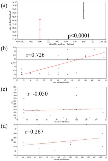 (a) Distribution of pulse rate of 2 groups; (b–d) Linear fitting and Spearman r value between body temperature and pulse rate in (b) total subjects; (c) Non-fever group; (d) Fever group.