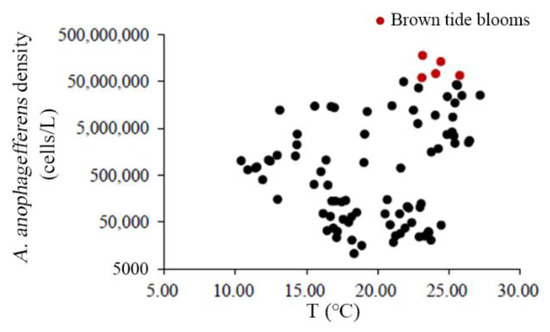 - Yao, P.; Lei, L.; Zhao, B.; Wang, J.P.; Chen, L. Spatial-temporal variation of Aureococcus anophagefferens blooms in relation to environmental factors in the coastal waters of Qinhuangdao, China. Harmful Algae 2019, 86, 106–118. [Google Scholar] [CrossRef]