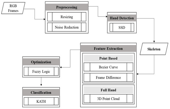 In this section, a detailed description of the proposed model is given. First, the video input is converted into RGB frames, then the frames are resized to a fixed dimension. Noise is removed and the quality of images is enhanced and sharpened. The second step is hand detection by first removing the background and extracting the foreground. A hand skeleton is extracted for localizing the points on the entire hand. Then the point-based and texture-based features are extracted. These features are optimized by using an optimization algorithm. At last, a classification algorithm is used for the classification of hand gestures for controlling smart home appliances. Figure 1 illustrates the proposed HGR system model structural design.