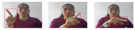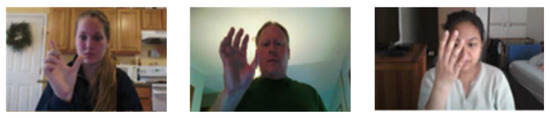 The IPN hand dataset [68] is a large-scale hand gesture video dataset. It contains 13 gestures, including pointing with one finger, pointing with two fingers, click with one finger, click with two fingers, throw up, throw down, throw left, throw right, open twice, double click with one finger, click with two fingers, zoom in and zoom out. The IPN dataset contains RGB videos with a resolution of 640 × 480 at 30 fps. Figure 10 shows the example images of the IPN hand dataset.