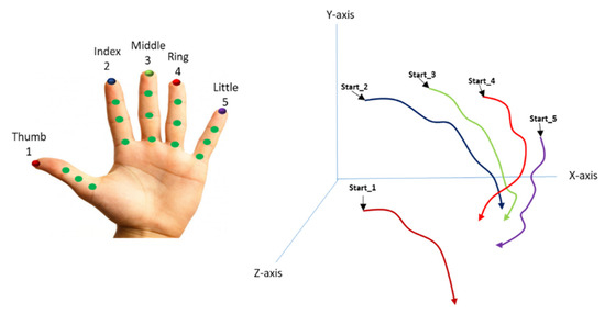 The landmark points localized on the entire hand are utilized for Bezier curves fitting for analyzing the trajectories of the hand in different gestures. For this, we have taken three control points to represent a curve using Equation (4);