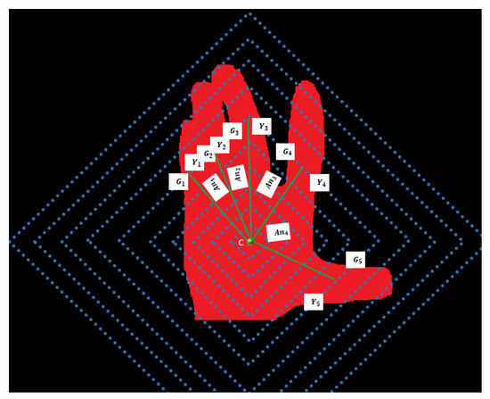 - First, a central point on the palm is taken and the maximum distance d between the central point and the edges Ei point of the gesture region is calculated. After that, ten different lengths of the radius are defined as . Next, the center of the rhombus is defined as C and the radiuses as rn. We have drawn 10 rhombuses (innermost is the first rhombus and outmost is the tenth rhombus) as shown in Figure 7. To highlight the effect of changing hand gestures, the color of the rhombus changes on the hand.