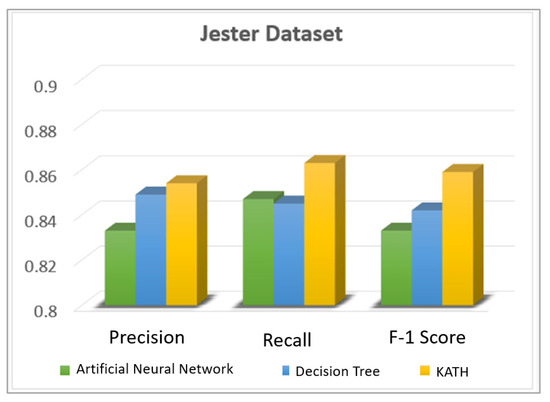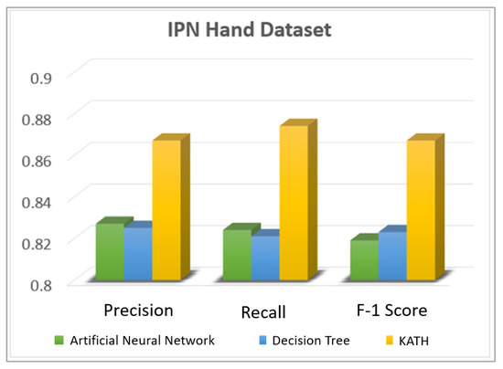In this segment, we compared the recall, precision, and F1-measure over the IPN hand dataset and the Jester dataset. For the classification of hand gestures, we used a decision tree, an artificial neural network, and we associated the consequences with the KATH classifier. Figure 12 shows the results over the IPN hand dataset and Figure 13 shows the results over the Jester dataset.