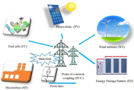 The grid operation planning model is one of the most effective alternative ways can generate the service-consuming power with better quality power supply, as demand for improved power supply quality in isolated or distant places grows [2,42]. Figure 1 displays a typical structure of a microgrid with power sources distribution. The expression balance of the system power load in period t is figured out as an equality constraint:
