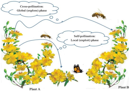 Flowers pollination algorithms (FPA) [34,36] are inspired by the pollination of plants and flowers in nature that has gained many academics’ attention because of their advantages of ease of implementation, fewer parameters, and quick changes. The FPA algorithm is based on two different pollination strategies: local pollination and global pollination. Four principles followed are figured out to mimic the two pollination procedures to develop a better mathematical model: