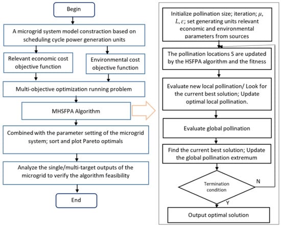 This study proposes a Hybridizing FPA with SCA (namely HSFPA) to enhance the flowers pollination algorithm for dealing with the complicated problem of microgrid operations planning. Strategies selected from the SCA method, e.g., adapting hop size, diversifying local search, and diverging agents, are used as the specific description of the proposed method in combining advantages to avoid the FPA algorithm drawbacks. The HSFPA is implemented to enhance diversity agents, increase convergence and prevent local optimal traps. The suggested method’s performance efficiency is verified using the selected benchmark functions in CEC2017 [40] and the microgrid operations planning test [41]. The suggested approach contributions are highlighted as follows: