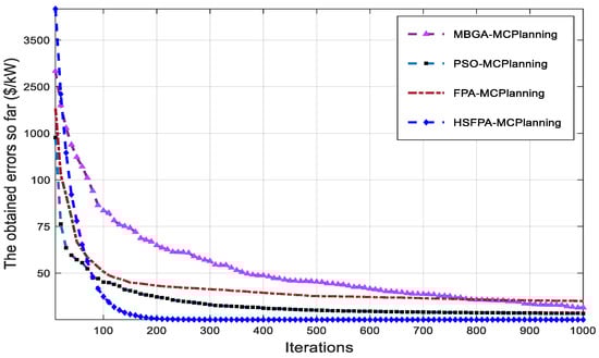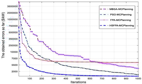 The algorithm convergence is necessary for finding the optimal result that allows for “jumping from” local optimal points to better ones based on the fitness values. The terms of convergence are also considered a good measure to get a “good” solution and are probably found in comparison algorithms for the optimal solution. The HSFPA is constructed based on the FPA and some strategy updating from the SCA algorithm. Pollination diversity has increased, and randomly produced segments are used to generate novel solutions. The convergence of the HSFPA would confirm with the inheritance algorithm of both proven convergence algorithms from FPA [47] and SCA [48] algorithms.