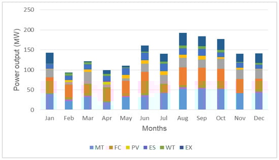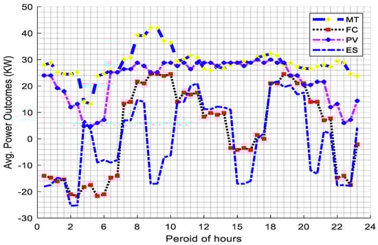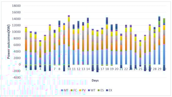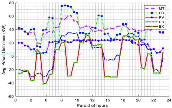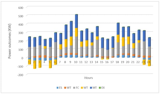 | The components power outcomes: FC, MT, ES, WT, PV, EX, t-time | |