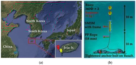 (a) The location of the hydrophone installation. The Hankyung-myeon area in the western region of Jeju Island (Red mark: 33°19′48.9″ N 126°08′59.7″ E) and Moseulpo tidal station (Yellow mark: 33°12′50.8″ N 126°15′04.5″ E); (b) Schematic diagram of the installation of a hydrophone (SM3M, Wildlife Acoustics Inc.) at a depth of 10 m from the seabed.