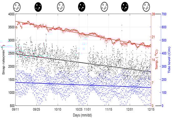 Long-term trends of snap rate (black dots; black line: linear fitting of snap rate), water temperature (red dots; red line: linear fitting of temperature), and tide level (blue dots; blue line: linear fitting of tide level). White and dark circles are the full moon and new moon, respectively.