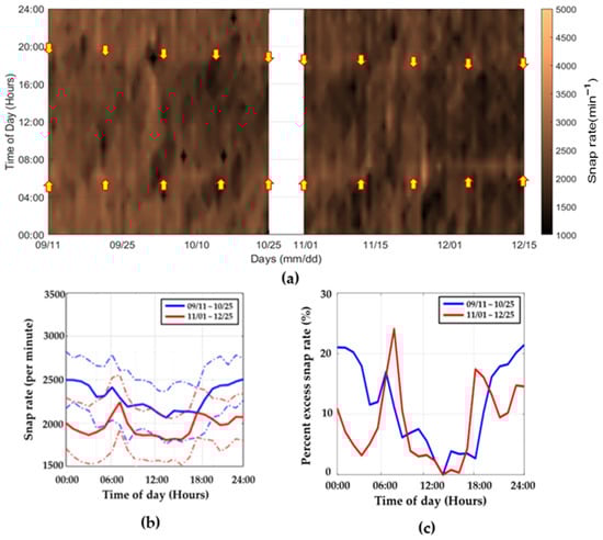 There were some distinct patterns of snapping sounds during the measurement period, as shown in Figure 4a. First, a high snap rate at sunrise and sunset is indicated by arrowheads, and the pattern is evident in winter. Second, the overall snap rate decreases from September to December. Third, there is a higher and lower pattern of snap rate twice a day. The means and standard deviations of the snap rate for the first-half and the second-half periods were 2304 ± 442 and 1961 ± 435 per minute, respectively, as shown in Figure 4b. The snap rate decreased from the first to the second half, mainly due to reduced water temperature and mean tidal level. Snap rate per minute was averaged to 2435 and 1973 at night and 2168 and 1902 during the day for the first- and second-half periods, respectively. At sunrise and sunset, the snap rate was much higher, up to 2355 in the second-half period, than during the day and night. In the first half, there was no sharp increase in the snap rate at sunrise and sunset; rather, a higher snap rate was observed at night. The percent excess snap rate is plotted in Figure 4c, and the mean snap rate increased up to 21% at night and 17% at sunrise and sunset compared with the one at daytime in the first-half period. However, the percent excess snap rate had a sharp peak at dawn at 24% and another small peak of 17% at sunset. The snap rate right after sunset decreased to 10% and then increased to 15% at midnight. Then, the snap rate was reduced to 3% just before sunrise in the second-half period. The percent excess snap rate difference between the first and second periods was the highest at night.